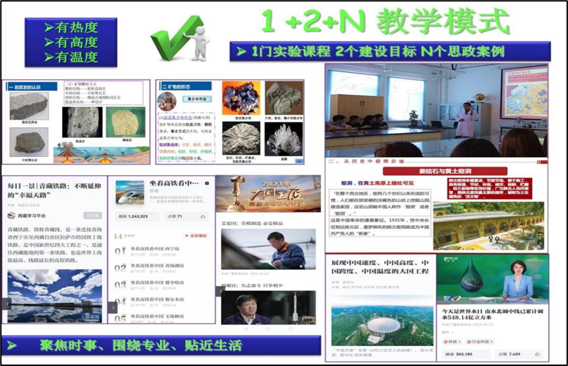 《工程地质与水文地质实验》注重思政教学环节设计,将实验教学知识点进行整合,重新规划教学内容和形式,打造“1+2+N”课程思政建设模式。围绕《工程地质与水文地质实验》一门课程,将实验课程建设和课程思政建设两个目标协同融合,打造涵盖N个典型案例的思政教学共享平台。以实验课程为载体,聚焦时事、围绕专业、贴近生活,采用启发式、案例式、研讨式等教学方法,构建“有热度、有高度、有温度”的实验课程思政教学体系。