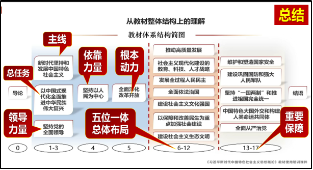 教学重点:围绕习近平新时代中国特色社会主义思想重大时代课题,讲清楚这一思想的时代背景、主要内容、科学体系和历史地位。准确把握新时代坚持和发展中国特色社会主义的总任务和战略安排,以及涵盖“五位一体”总体布局和“四个全面”战略布局的丰富内涵、实践要求和系列重大战略举措。